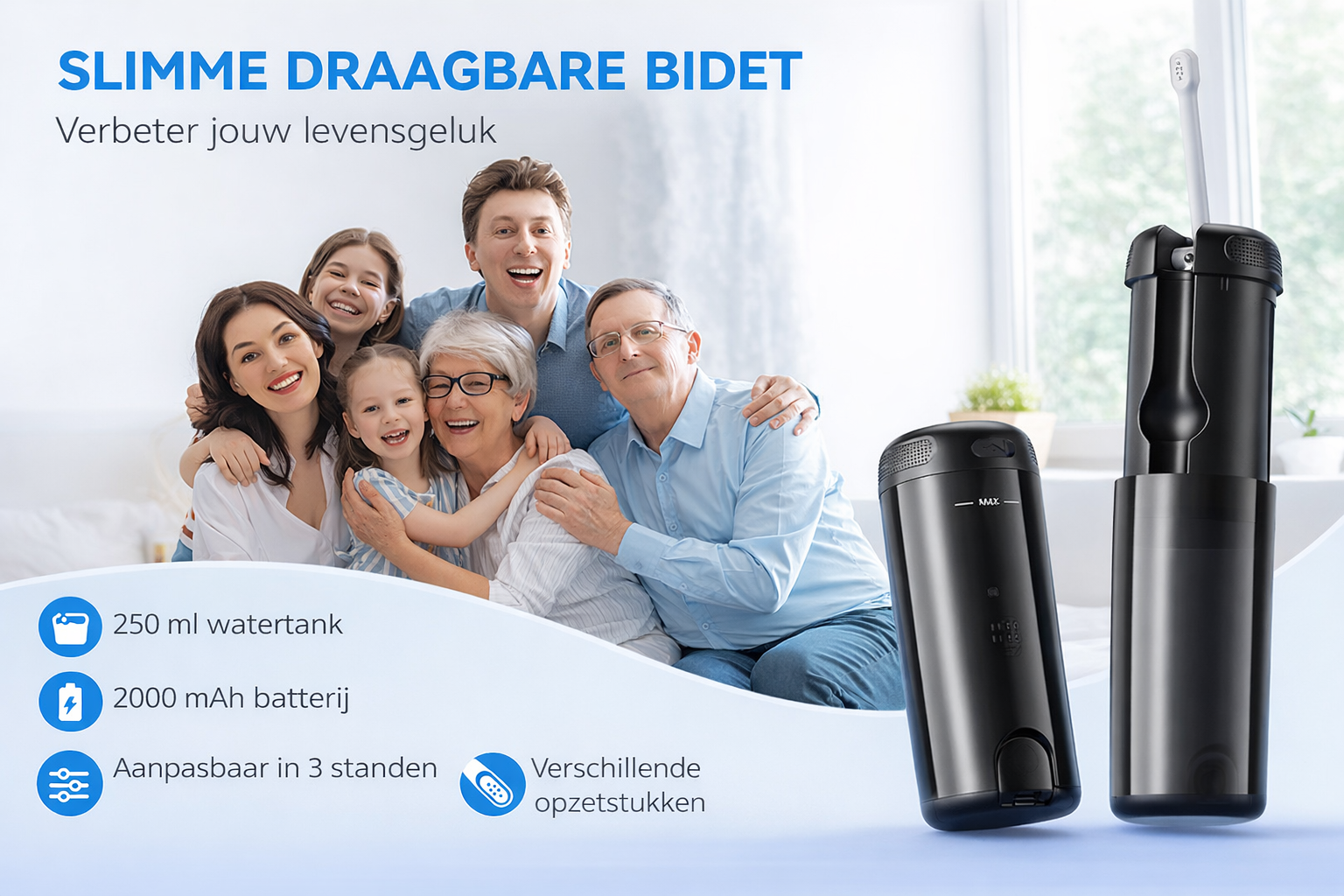 Deze bidetreiniger is ontworpen voor het hele gezin. Van jonge kinderen tot volwassenen en ouderen – de zachte waterstraal zorgt voor een comfortabele en hygiënische reiniging voor iedereen. Vooral voor ouderen of mensen met een gevoelige huid kan reinigen met water veel prettiger en zachter zijn dan toiletpapier.